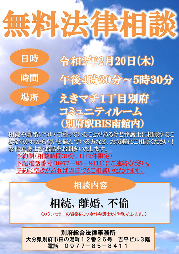 大分県別府市に事務所を構える別府総合法律事務所です。大野美香弁護士と上田真也弁護士が皆様の相談に応じております。離婚問題などのトラブルでお悩みの方は是非一度ご連絡下さい。